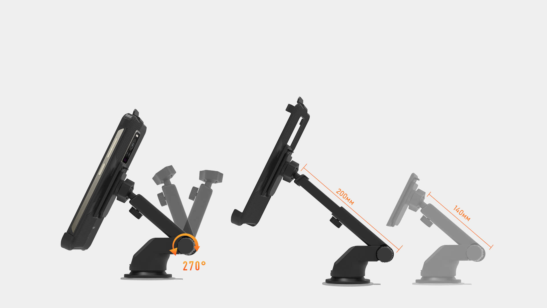 Держатель Armor надёжно удерживает телефон в поле зрения. Направляющую можно выдвигать от 14 до 20 см, наклонять от 0° до 270°.