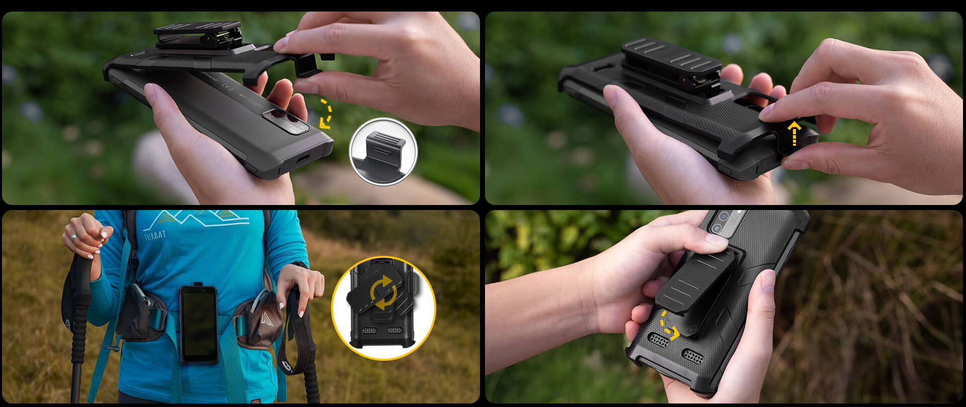 В чехле присутствует клипса, которая поворачивается на 180°, также можно установить крепление для карабина. С чехлом смартфон стал более портативным.