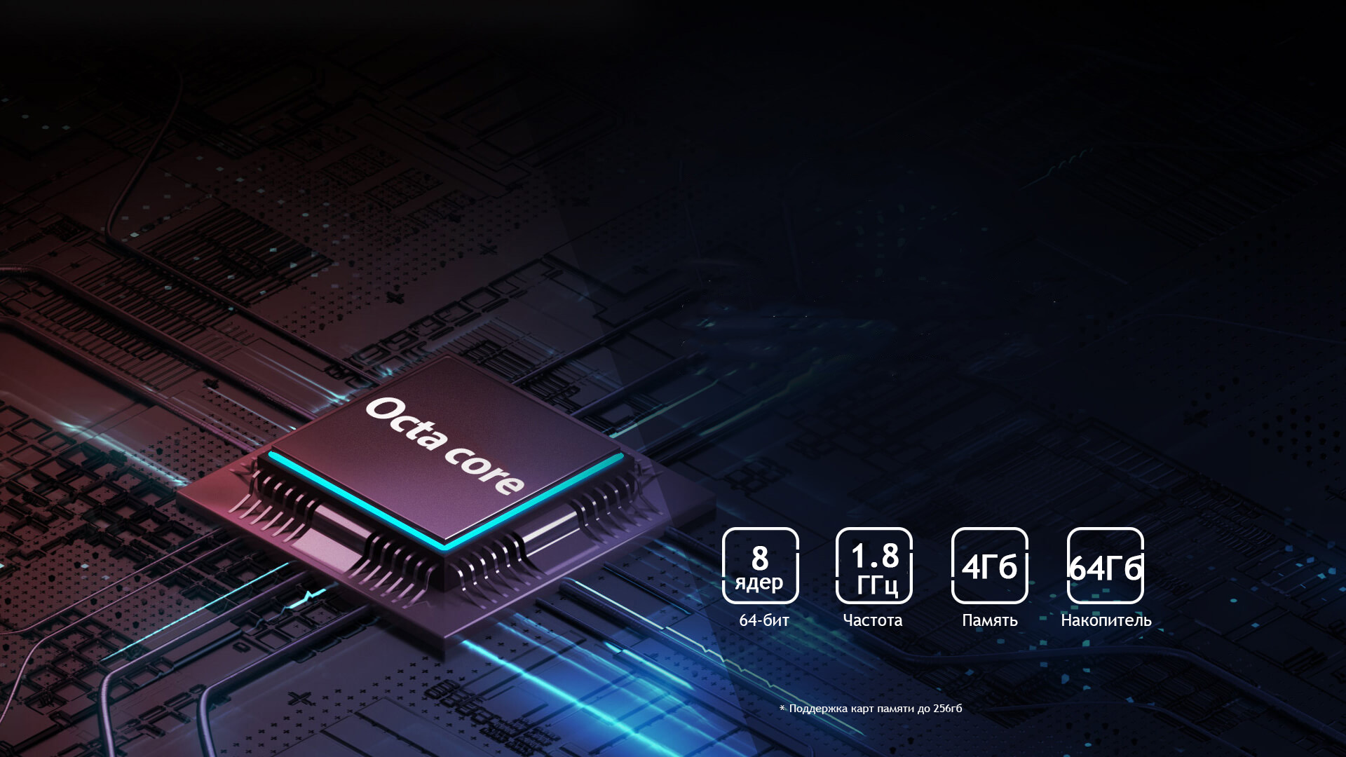 8-ядерный процессор, выполненный по 12нм техпроцессу обеспечивает быструю и плавную работу в режиме многозадачности, позволяет смотреть видео, играть в игры. 4+64Гб памяти обеспечивают одновременную работу множества приложений. Кроме того, смартфон поддерживает карты памяти MicroSD до 256Гб.