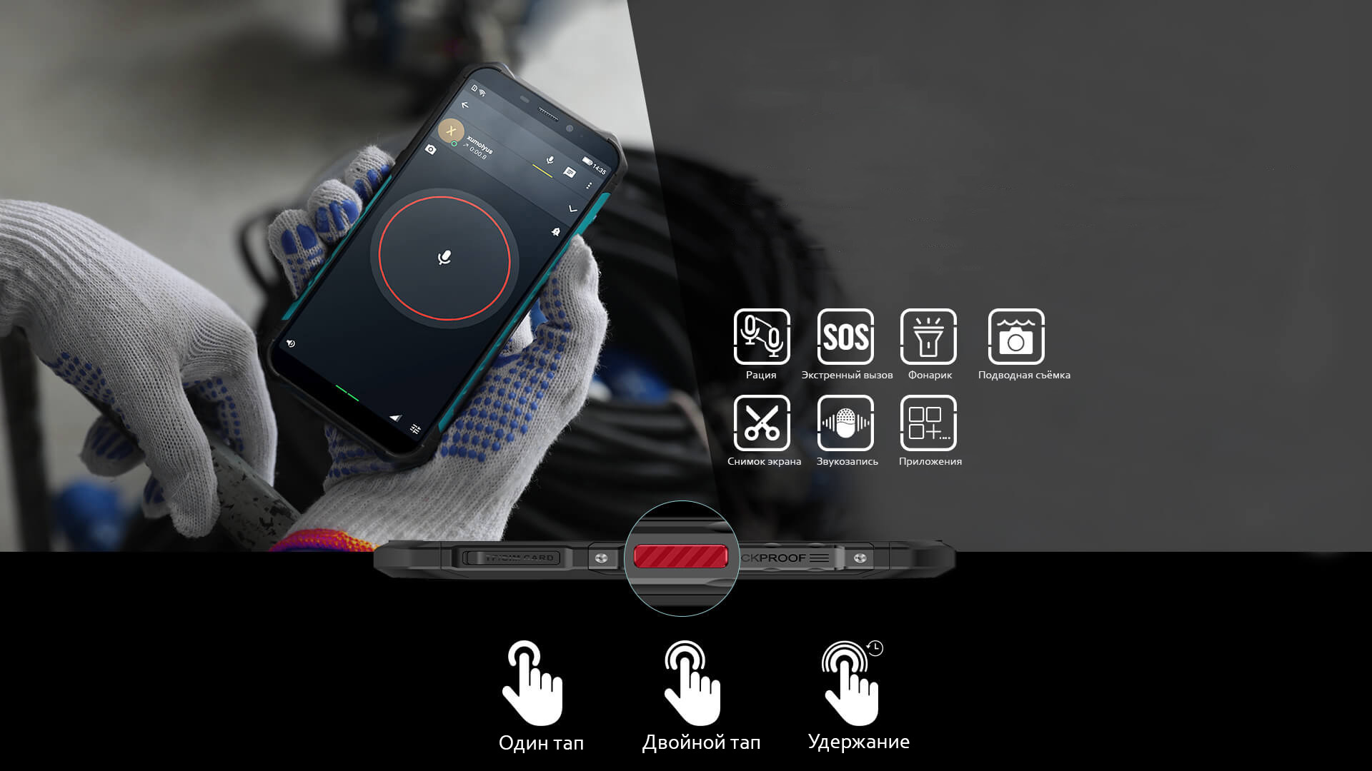Вы можете запрограммировать аппаратную кнопку на одну из нескольких функций. Можете запускать любое приложение, звукозапись, фонарик, скриншот, режим подводной съёмки, сигнал SOS или включать режим приёма в рации Zello, минимизируя потребление энергии.