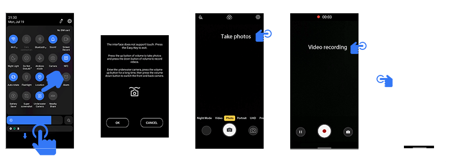 Разверните быстрое меню или нажмите на аппаратную кнопку, если ранее её настроили, и включите режим подводной съёмки. Тачскрин отключается и управление функциями переходит на кнопочное управление. Громкость вверх делает фото, громкость вниз переключает режим с фото на видео и обратно. Аппаратная кнопка завершает режим подводной съёмки и включает обычный режим.